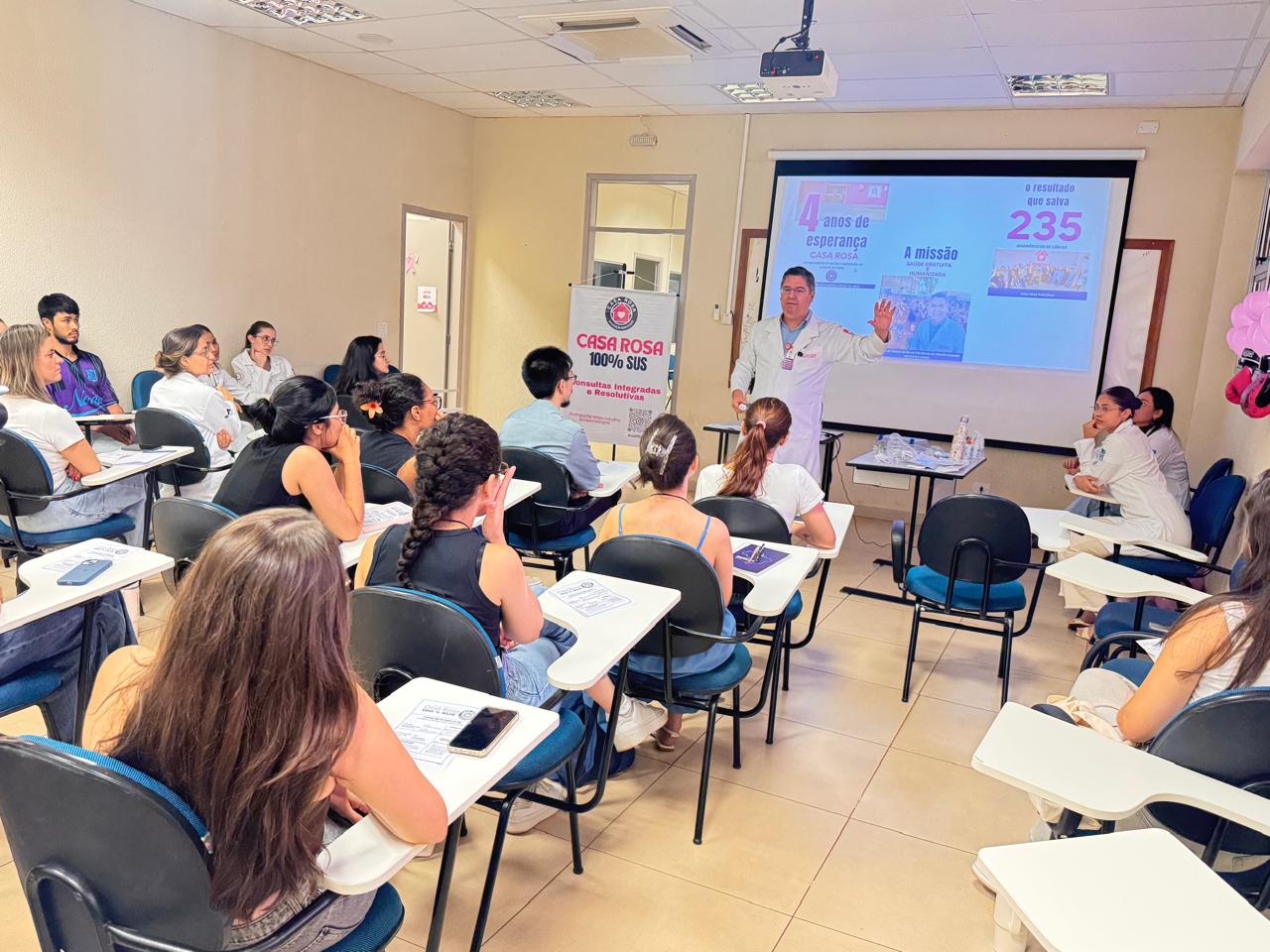 Durante a jornada da Universidade Estadual de Mato Grosso do Sul, a Associação Beneficente Casa Rosa foi representada pelo médico mastologista Victor Rocha, responsável por conduzir o minicurso “Casa Rosa Acadêmico: o primeiro olhar sobre o câncer de mama”. A proposta foi aproximar os estudantes da realidade do atendimento clínico e reforçar a importância do diagnóstico precoce.
