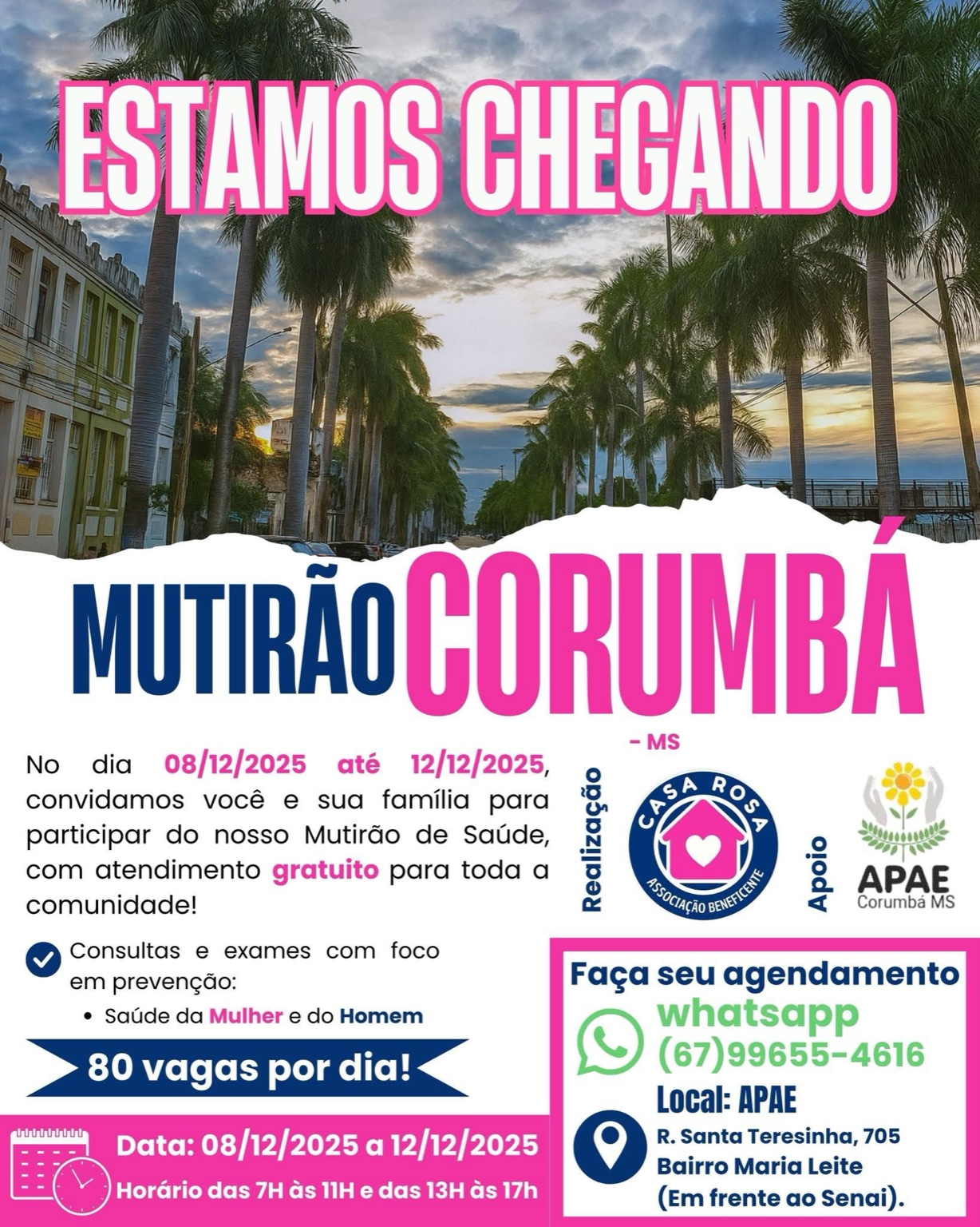 O mutirão ocorrerá na APAE de Corumbá, parceira da iniciativa, com 80 vagas diárias para atendimentos. A programação inclui consultas e exames preventivos voltados tanto para a saúde feminina quanto masculina, reforçando a importância do cuidado constante — e não apenas em campanhas sazonais.