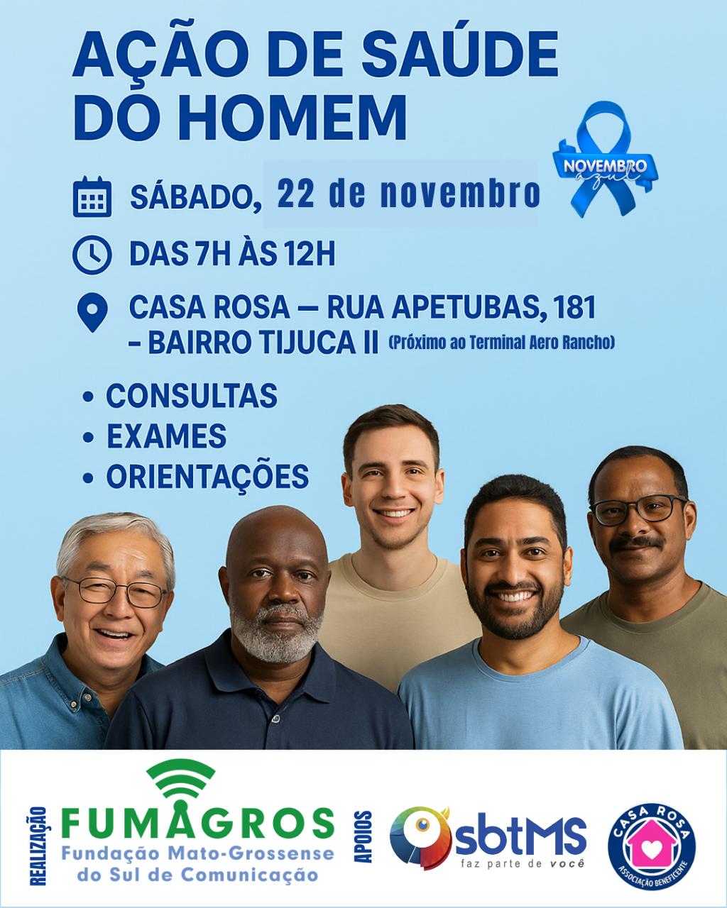 A Casa Rosa realiza neste sábado (22) uma grande Ação de Saúde do Homem, em referência ao Novembro Azul, oferecendo uma manhã de atendimentos gratuitos focados em prevenção, cuidado e orientação. A iniciativa acontece das 7h às 12h na sede da instituição, localizada na Rua Apetubas, 181, no Bairro Tijuca II, próximo ao Terminal Aero Rancho.