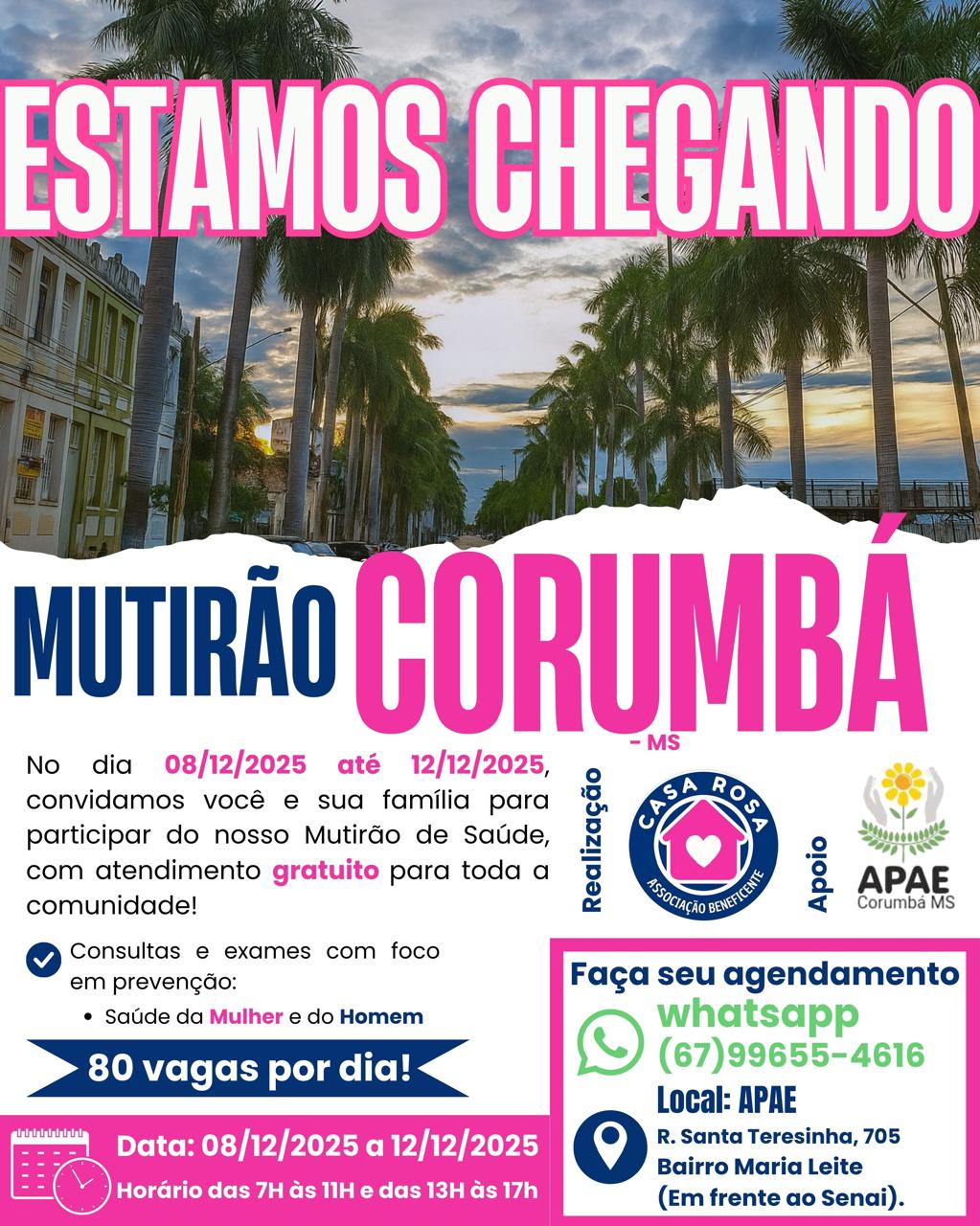A Associação Beneficente Casa Rosa promove, entre os dias 8 e 12 de dezembro de 2025, um grande Mutirão de Saúde no município de Corumbá (MS). A ação, realizada em parceria com a APAE de Corumbá, oferecerá consultas, exames preventivos e orientações de saúde totalmente gratuitas para a comunidade.