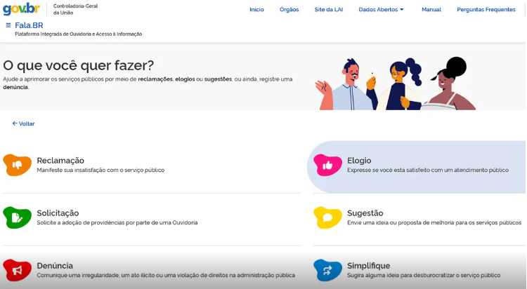 A plataforma Fala.BR é a Plataforma Integrada de Ouvidoria e Acesso à Informação do Poder Executivo Federal e está em funcionamento desde 2019. Por meio dela, cidadãos podem enviar denúncias, reclamações, sugestões, solicitações e elogios para órgãos federais e também para estados e municípios que aderiram ao sistema.