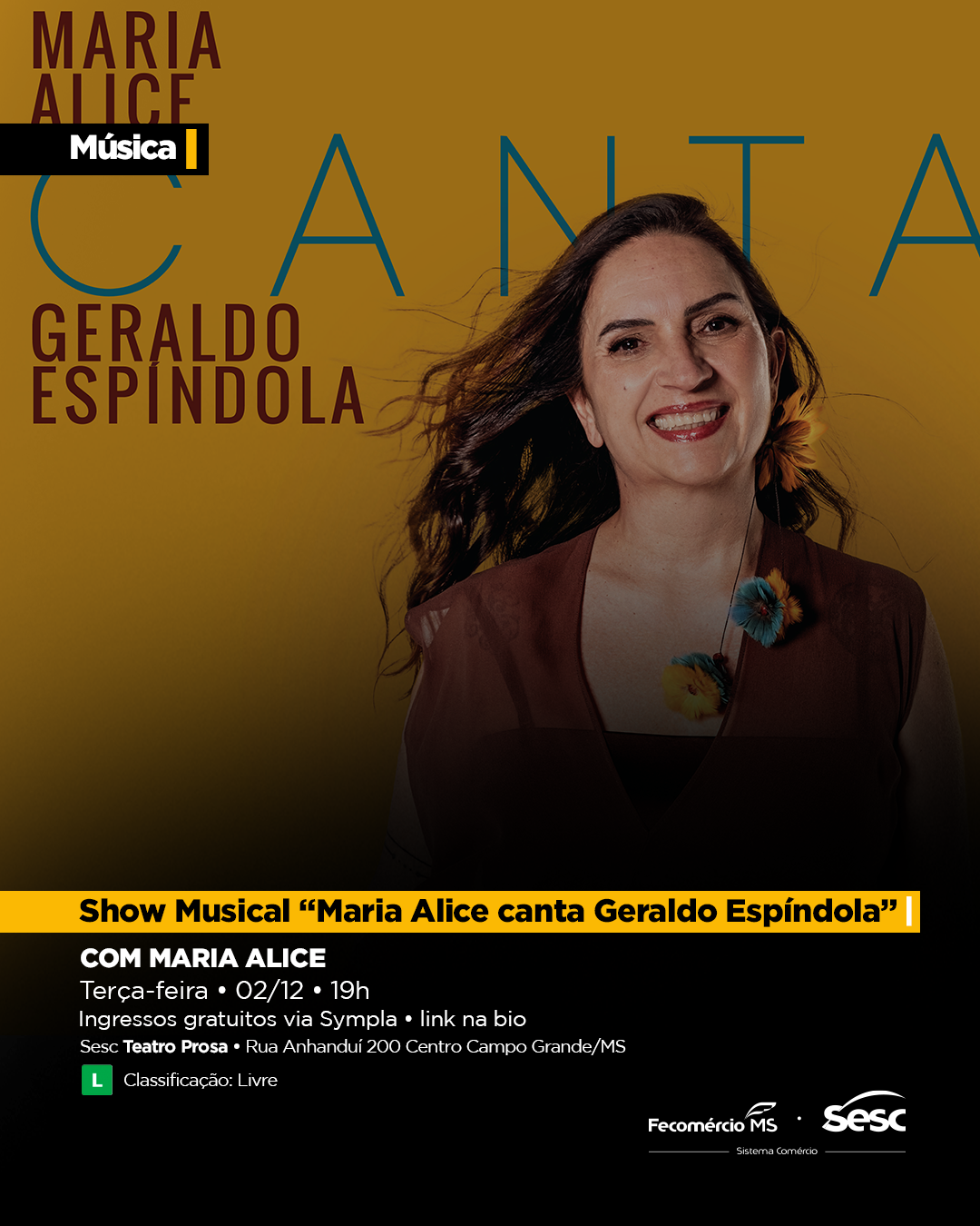 O espetáculo marca a estreia oficial do disco, que reúne 14 composições de Geraldo Espíndola — um dos ícones da música sul-mato-grossense e brasileira — revisitadas em novos arranjos e com a interpretação marcante de Maria Alice.