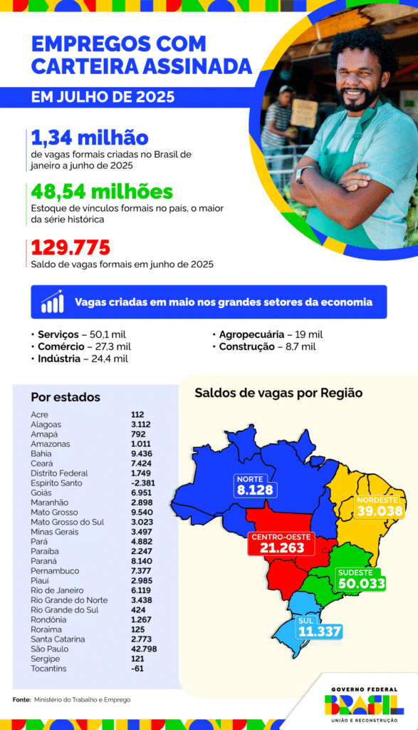 ATIVIDADES ECONÔMICAS – O sétimo mês de 2025 apresentou variação positiva nos cinco grandes agrupamentos de atividades econômicas avaliados: Serviços, Comércio, Indústria, Construção e Agropecuária. O saldo foi positivo em 25 das 27 Unidades da Federação. Com os indicadores de julho, o total de vínculos empregatícios formais ativos no país, número conhecido como estoque, chegou a 48,54 milhões, um valor recorde.