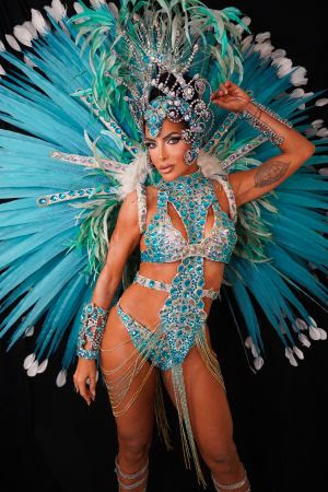 Para a ocasião, Carla apostou em um figurino impactante em tons de azul-turquesa e verde-água, ricamente trabalhado em pedrarias, cristais e aplicações brilhantes. O look contou com top estruturado, recortes estratégicos e hot pant bordada, além de franjas e correntes que ganharam movimento a cada passo. O visual foi arrematado por um imponente costeiro com plumas artificiais em degradê de azul, cristais e acabamento minucioso. Nos pés, sandálias de salto alto com tiras cravejadas até a panturrilha reforçaram o glamour e a imponência da fantasia.