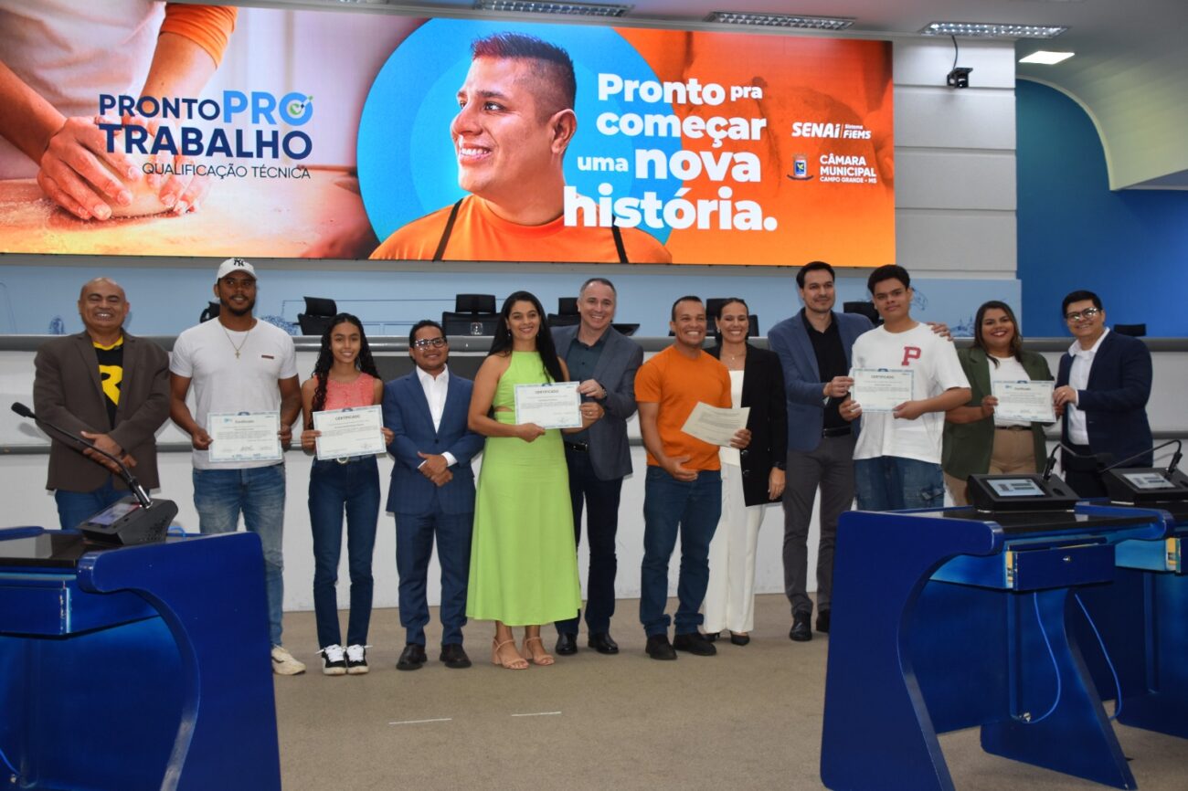 O Senai, em parceria com a Câmara Municipal de Campo Grande, realizou nesta quarta-feira (19) a primeira formatura dos alunos do projeto Pronto Pro Trabalho, iniciativa que oferece cursos gratuitos e focados nas demandas do mercado local. Ao todo, mais de 450 trabalhadores concluíram a capacitação. A expectativa é de que mais de 1,5 mil pessoas sejam formadas até o fim do ano.