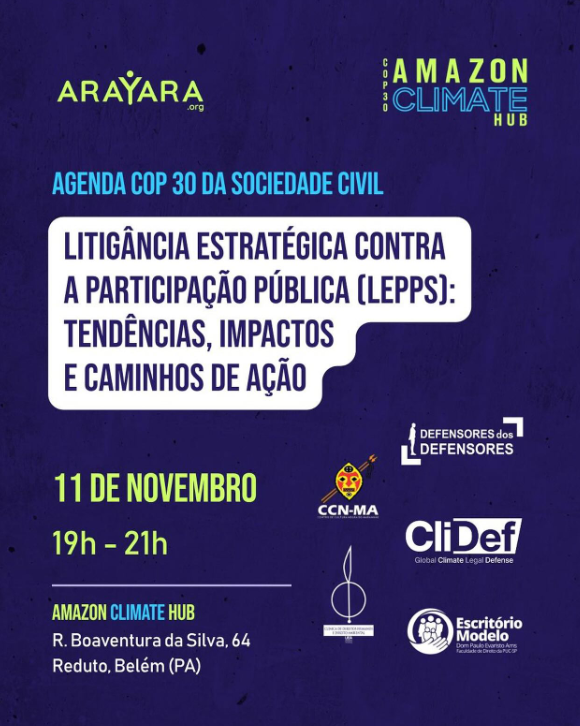 A atividade integra a Agenda COP 30 da Sociedade Civil e é organizada por entidades que atuam na defesa de direitos humanos e ambientais, entre elas o Escritório Modelo Dom Paulo Evaristo Arns, da Faculdade de Direito da PUC-SP, o Global Climate Legal Defense (CliDef) e a anfitriã Arayara.org.