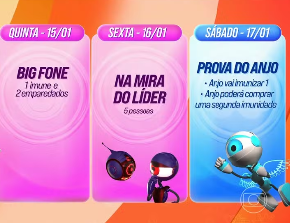 A semana começa nesta terça-feira (13) com a primeira Prova do Líder, que definirá quem assume o comando da casa logo nos primeiros dias do jogo. Já na quinta-feira (15), o Big Fone tocará pela primeira vez no BBB 26. Quem atender ficará imune e terá o poder de indicar dois participantes diretamente ao Paredão. O público decide, por meio de votação no gshow, qual dos três telefones disponíveis irá tocar.