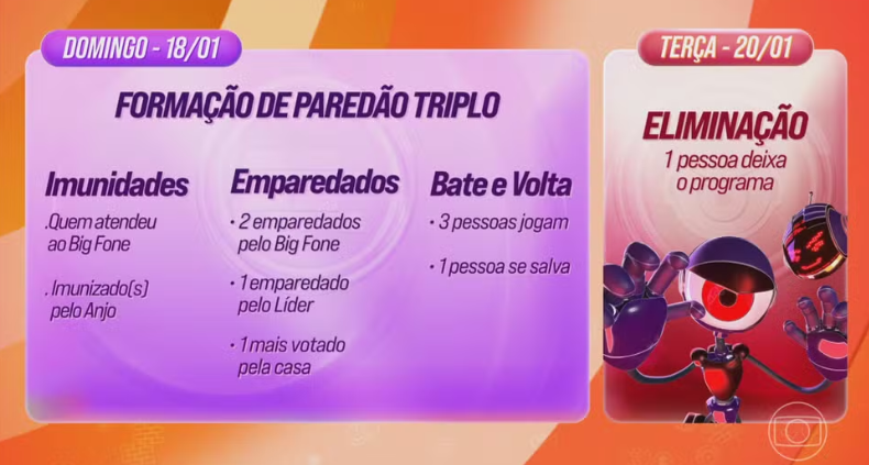 Antes da definição final, três emparedados disputam a Prova Bate e Volta, e apenas um se salva. Ao final do programa ao vivo, o público conhecerá oficialmente o primeiro Paredão Triplo do BBB 26.