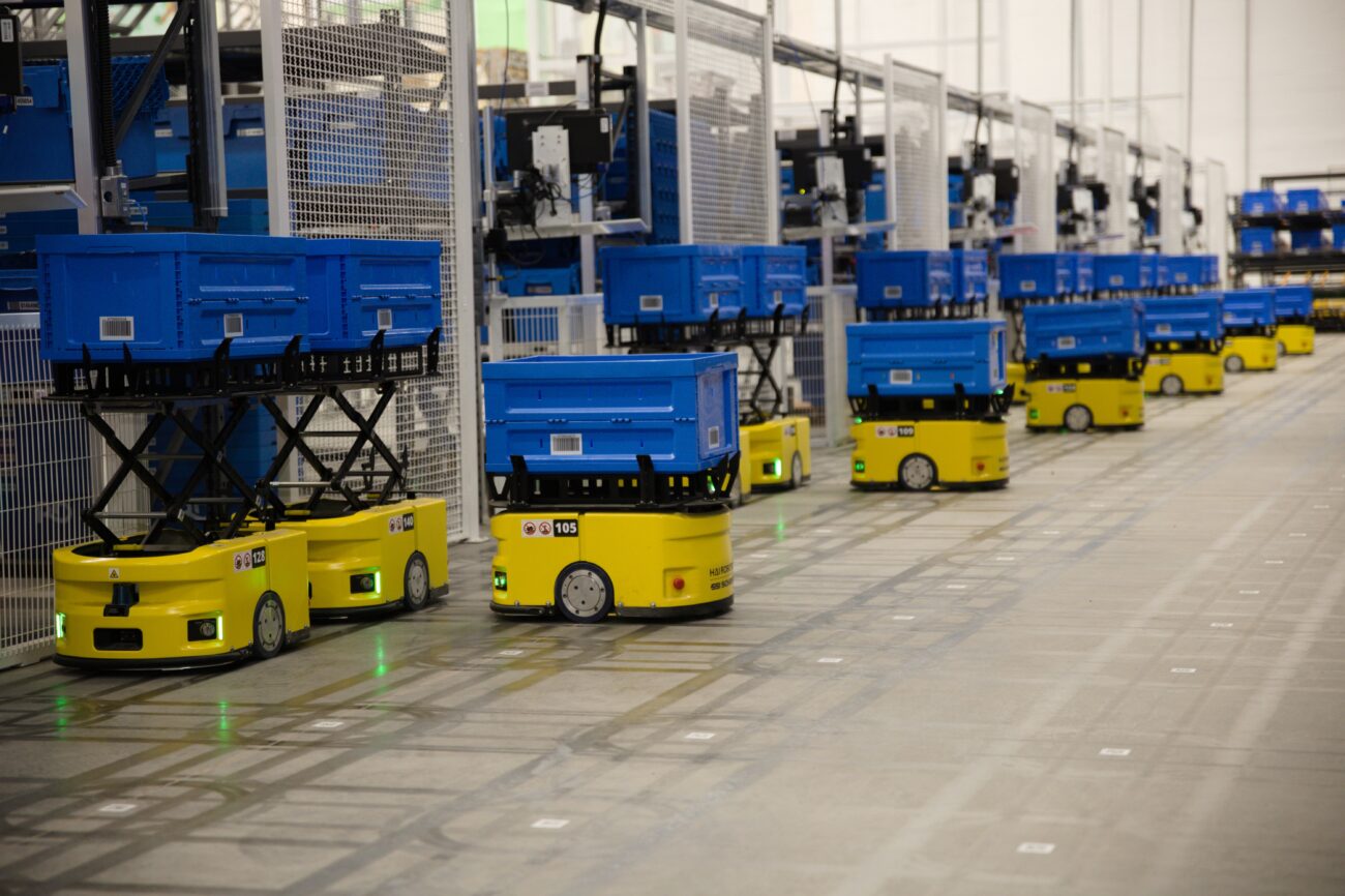 O centro de Viana adota um modelo híbrido que combina a atuação de cerca de 200 colaboradores com 90 robôs autônomos — responsáveis pela movimentação e manuseio das mercadorias de forma integrada. Essa automação, inédita no país, reúne duas tecnologias complementares: os AMRs (Autonomous Mobile Robots), que transportam estantes inteiras até as estações de separação, e os ACRs (Autonomous Case-handling Robots), que operam verticalmente em estruturas de até 10 metros de altura para selecionar e mover caixas com precisão.