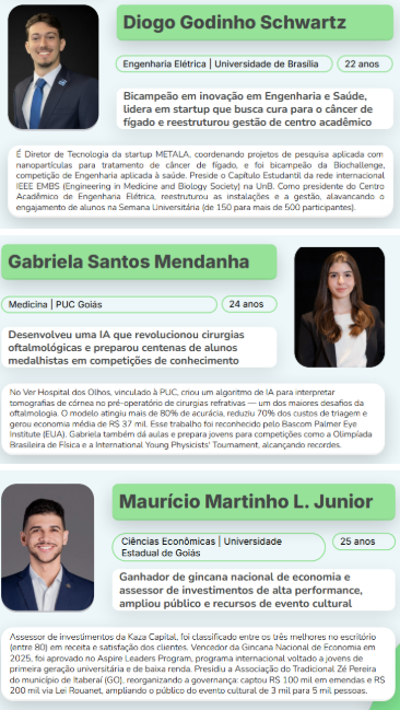 O Prêmio Na Prática: Protagonismo Universitário reconhece jovens que fazem a diferença em todas as regiões do país. No Centro-Oeste, três estudantes de Goiás e do Distrito Federal se destacam pela excelência acadêmica, inovação científica e atuação social transformadora.